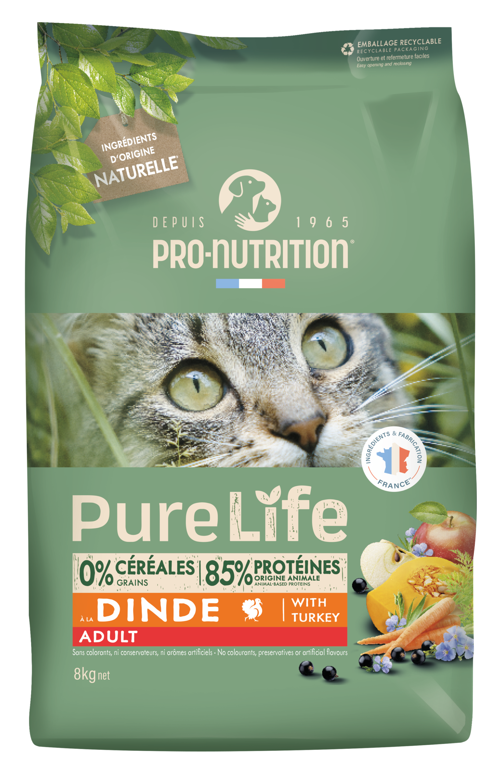Gracias al aporte de vitamina E y fibras de manzana, las croquetas Pure Life Adult con Pavo responden a las necesidades nutricionales específicas de los gatos adultos, contribuyendo al buen funcionamiento de sus defensas naturales. La presencia de biotina, zinc quelatado, omega 6 y omega 3 en nuestras recetas favorecen una piel sana y un pelaje sedoso.